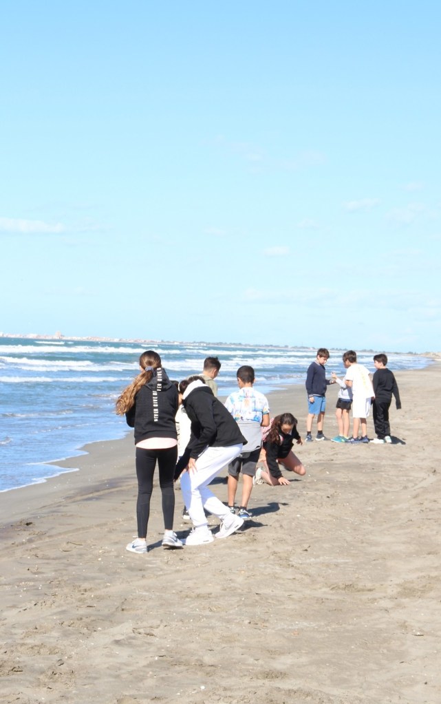 Mi-mai et à vélo, les CM2 ont rejoint la plage Ouest pour découvrir les trésors cachés laissés par la mer, une activité pédagogique menée par les chargées de mission du PNRC, Delphine, Léna et Julie. La mission des élèves était de ramasser des éléments déposés par l’eau et de les classer parmi les 3 catégories suivantes : « animal », « végétal », « humain ».