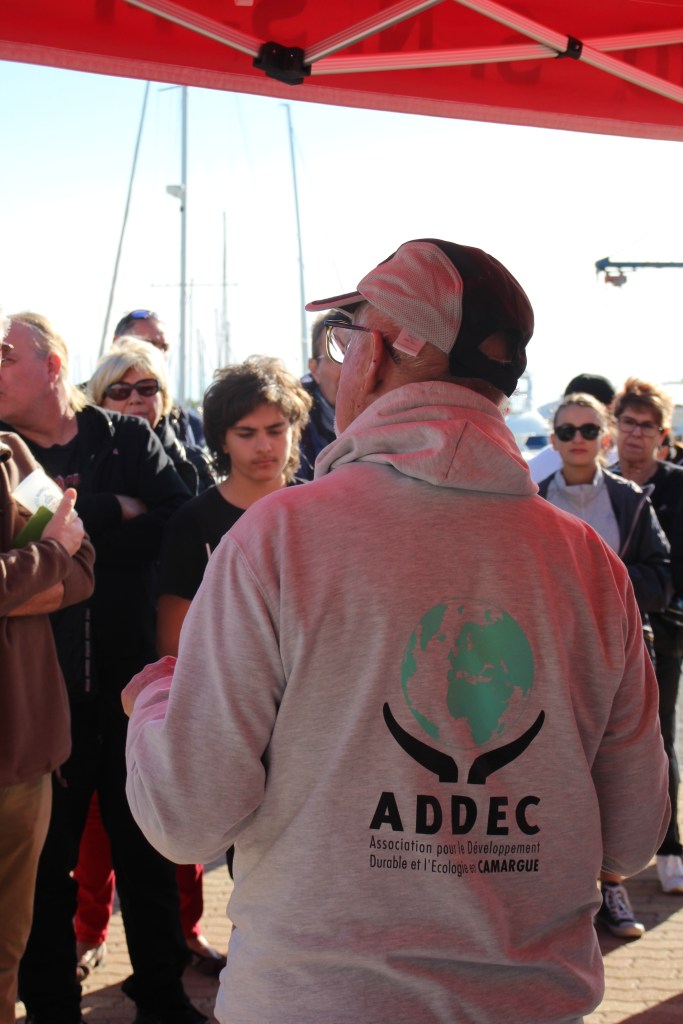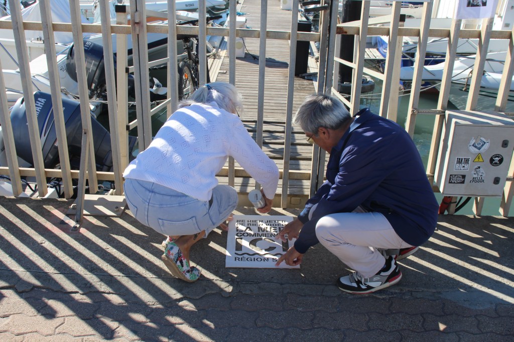 Un message qui parle à l’ Association pour le Développement et l’Écologie en Camargue, association locale plus que jamais active dans la Ville des Saintes Maries de la Mer. André et Colette, accompagnés par un élu de la commune, François Belmonte, ont peint au sol ce message le long de la promenade du port. Ouvrez l’œil. A noter que ce message est peint avec une peinture écologique, à base de craie et non nocive pour la végétation.